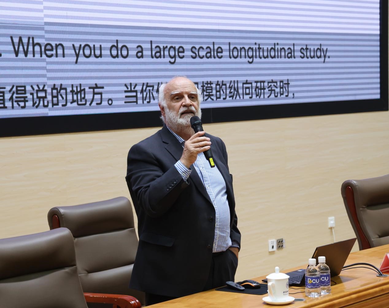當日下午,Edward Melhuish院士在順義校區綜合樓西階梯教室作“兒童早期教育、神經科學與兒童長期發展”主題講座,通過多國實證研究證明:“優質早期教育可提升兒童終身發展能力,其中語言能力與自我調節能力尤為關鍵。”在互動環節,師生就“數字技術教育應用邊界”、“弱勢兒童精準干預”等議題深度交流。