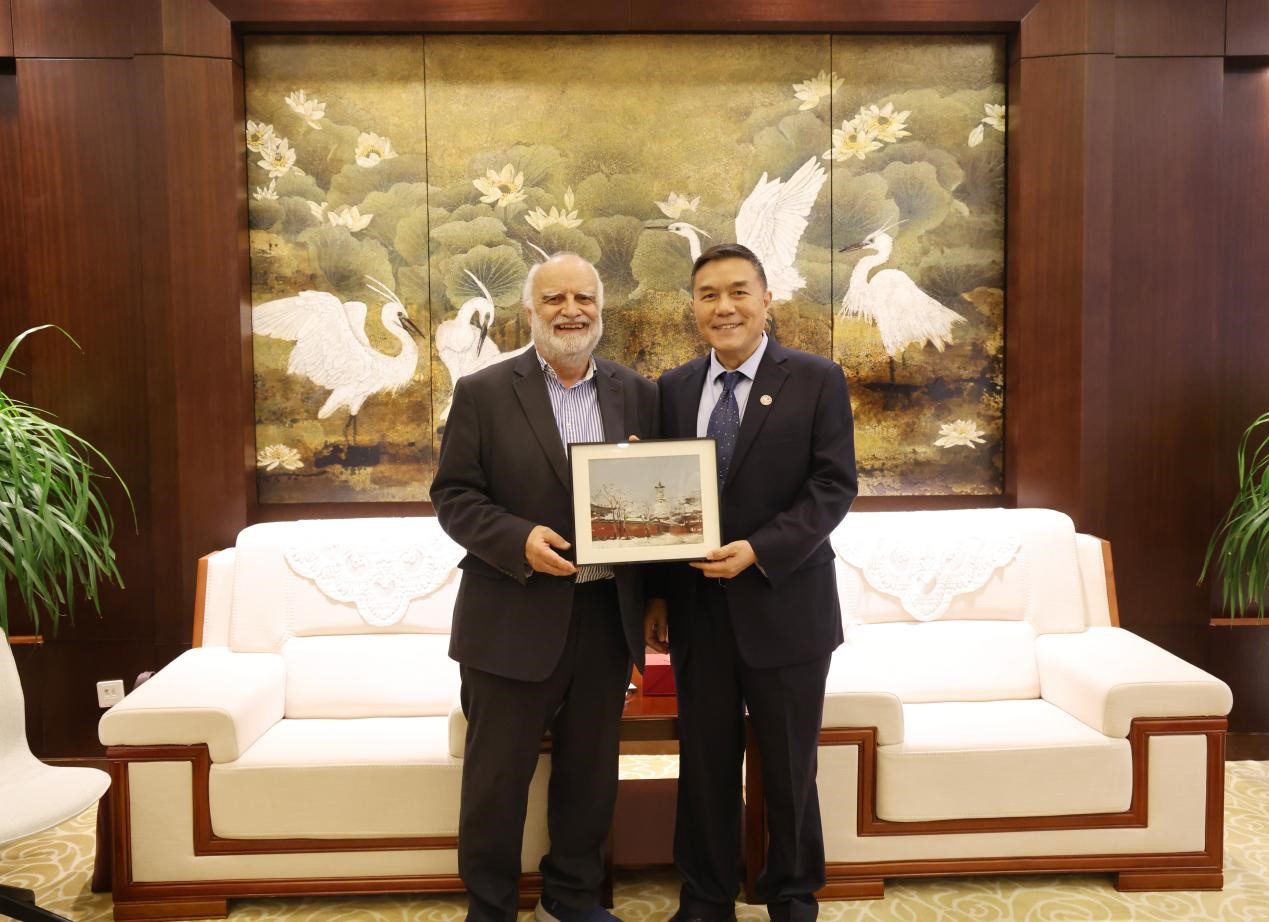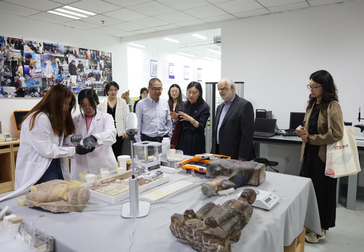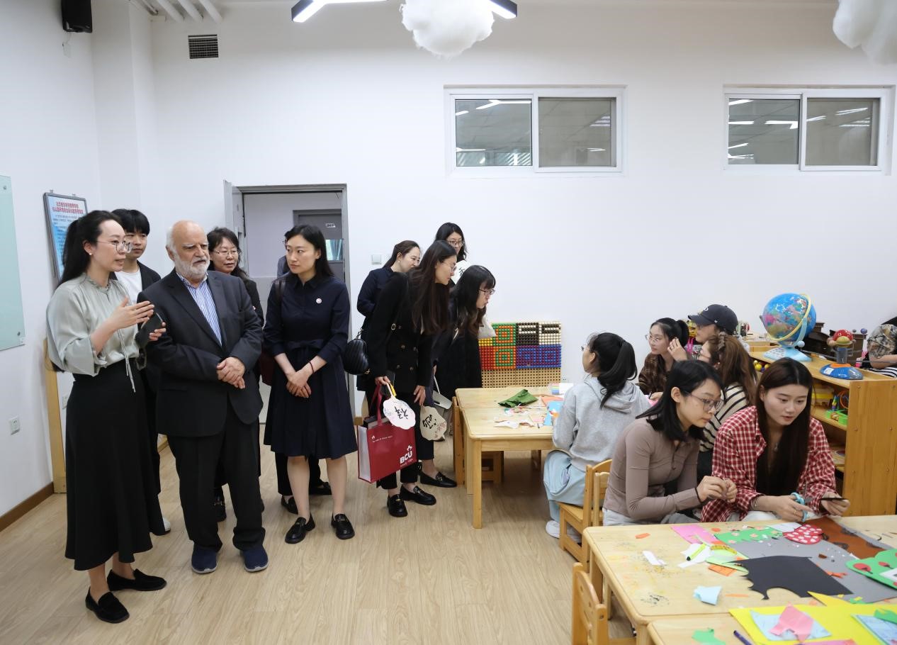 聘任儀式前,Edward Melhuish院士于5月22日參訪我校順義校區及相關學部。我校黨委書記龔裕在參觀前會見并向院士重點介紹了學校的基本情況。在文化遺產學部主任陳秋榮的陪同講解下,院士重點參觀了明代漆棺數字化修復、微痕技術復原碑刻等創新成果,稱贊“科技與傳統的融合體現了東方智慧”。在教育學部,院士與學部主任周建輝及一線教師邊走訪邊交流,觀摩了蒙臺梭利幾何教學、繪本閱讀課程等實訓課堂,特別肯定嬰幼兒撫觸操對神經發育的促進作用。