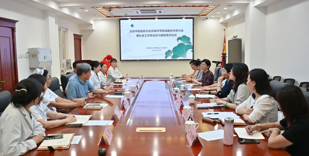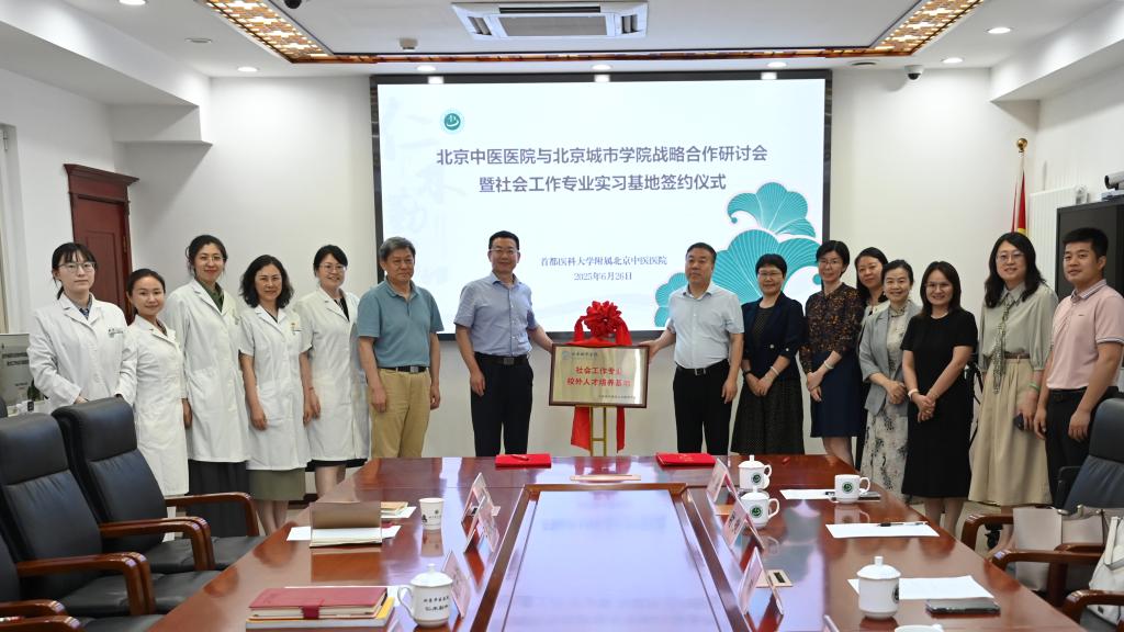 6月26日,我校與首都醫科大學附屬北京中醫醫院戰略合作研討會暨社會工作專業實習基地簽約揭牌儀式在北京中醫醫院舉行。北京中醫醫院黨委書記劉中勛、院長劉清泉及護理部、藥學部、醫務社工部相關負責人,我校校長劉林、副校長胡麗琴及教務處、公共管理學部、生物醫藥學部相關負責人,社會工作專業教師代表共同出席活動。