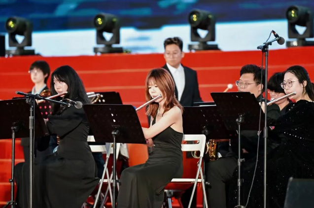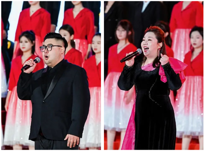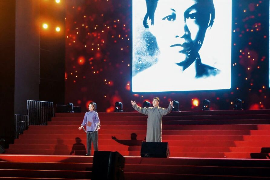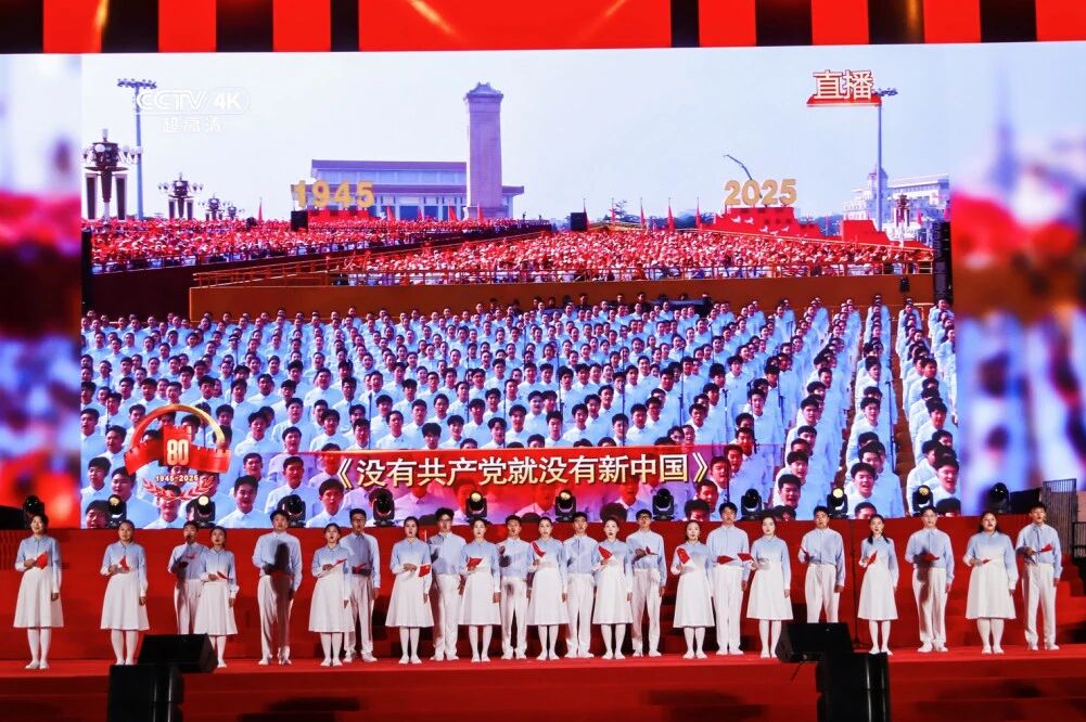 整場慶典分為“山河熱血”“砥礪前行”“青春報國”三大篇章。音詩畫表演《松花江上》再現東北抗聯戰士與敵人殊死搏斗畫面;楊靖宇后代馬繼民親臨現場講述祖輩革命事跡,黨委書記龔裕為其頒發校外德育導師聘書;情景詩朗誦《烽火家書》字字含情;鋼琴與合唱《保衛黃河》旋律激昂;歌曲《我的祖國》中的畫面,更是幾代中國人共同守護的家園記憶;群舞《東方紅》用青春的舞步,詮釋出歷史的溫度與時代的激情;中關村一小順義學校童聲合唱《玉盤》、退役大學生士兵合唱《祖國不會忘記》等節目,傳遞了愛國情懷與責任擔當。參與紀念抗戰勝利80周年閱兵合唱團的學子再次登臺,與觀眾齊聲高歌《沒有共產黨就沒有新中國》,將氣氛推向高潮。
