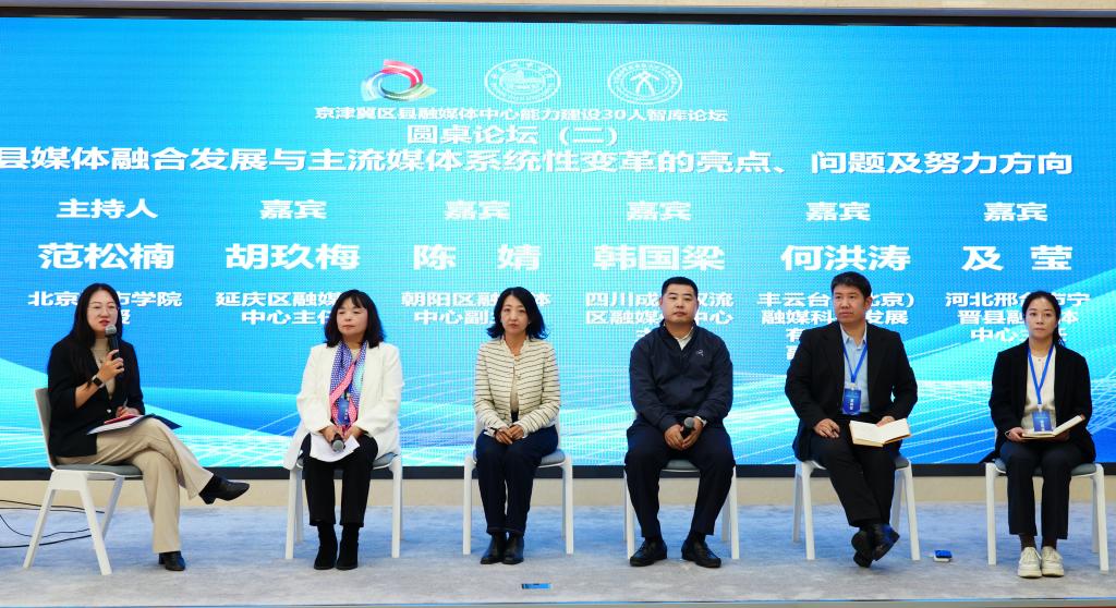 在北京城市學(xué)院數(shù)智傳播研究院副院長(zhǎng)范松楠主持的圓桌論壇(二)上,北京市延慶區(qū)融媒體中心主任胡玖梅介紹,該中心通過體制機(jī)制改革、本土文化深耕和文創(chuàng)產(chǎn)品開發(fā)已形成特色優(yōu)勢(shì),未來將繼續(xù)推進(jìn)技術(shù)創(chuàng)新與區(qū)域協(xié)同發(fā)展。北京市朝陽區(qū)融媒體中心副主任陳婧分享了依托雙語團(tuán)隊(duì)與國(guó)際傳播布局,推動(dòng)政務(wù)服務(wù)、文化傳播與社會(huì)參與深度融合的實(shí)踐經(jīng)驗(yàn)。四川省成都市雙流區(qū)融媒體中心主任韓國(guó)梁從基層服務(wù)和社會(huì)治理角度出發(fā),分享了融媒體打通服務(wù)群眾“最后一公里”的有效路徑。豐云臺(tái)(北京)融媒科技發(fā)展有限公司副總經(jīng)理何洪濤分享了通過技術(shù)賦能、央地協(xié)同等舉措推動(dòng)媒體深度融合、提升全媒體生產(chǎn)傳播效能的實(shí)踐探索。河北省邢臺(tái)市寧晉縣融媒體中心主任及瑩介紹,該中心通過平臺(tái)重構(gòu)、機(jī)制創(chuàng)新和運(yùn)營(yíng)轉(zhuǎn)型打造全域融合傳播體系,依托精品欄目與文創(chuàng)產(chǎn)業(yè)實(shí)現(xiàn)可持續(xù)發(fā)展。