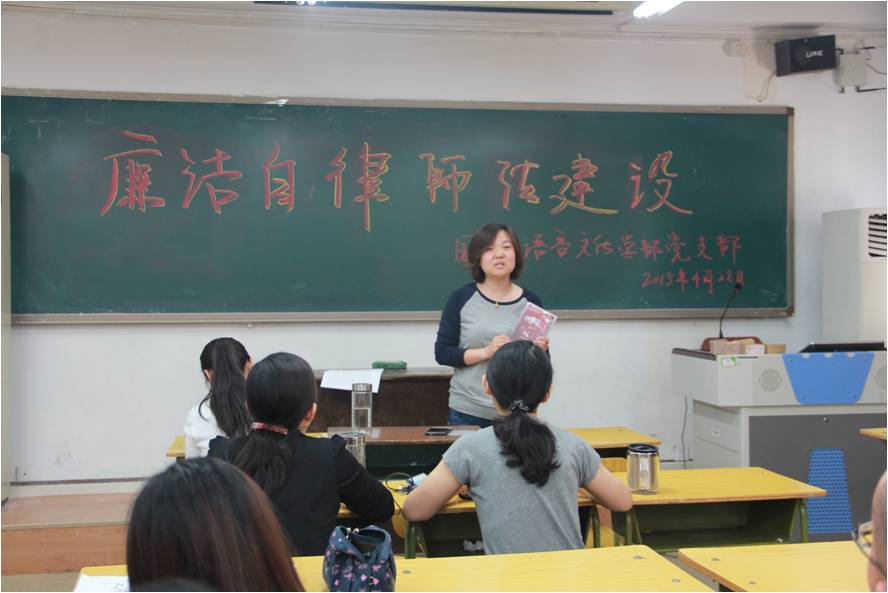 為了深入貫徹落實黨中央關于黨風廉政工作的部署要求,響應教育部積極推動高校廉政文化建設的號召,2015年4月28日,語言黨支部在校本部教一樓601開展了“廉潔自律、師德建設”的學習活動。國際學部、語言學部所有老師出席并參與了本次學習活動。