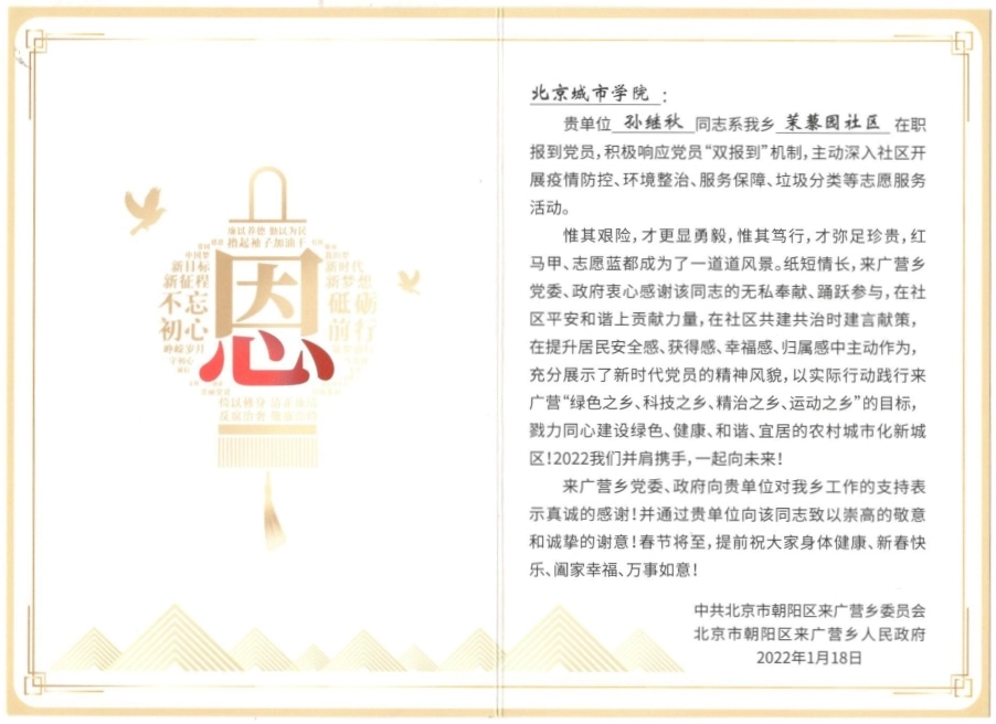近日,學(xué)部收到中共北京市朝陽(yáng)區(qū)來(lái)廣營(yíng)鄉(xiāng)委員會(huì)、北京市朝陽(yáng)區(qū)來(lái)廣營(yíng)鄉(xiāng)人民政府發(fā)來(lái)的一封表?yè)P(yáng)信。國(guó)際文化與傳播學(xué)部黨支部黨員孫繼秋同志積極響應(yīng)黨員“雙報(bào)到”機(jī)制,主動(dòng)深入茉藜園社區(qū)各項(xiàng)志愿服務(wù),得到了鄉(xiāng)黨委、鄉(xiāng)政府的高度肯定,并對(duì)其無(wú)私奉獻(xiàn)、踴躍參與的精神進(jìn)行了高度贊揚(yáng)。信中也對(duì)我校表示真誠(chéng)的感謝,樸素真摯的話語(yǔ)讓我們倍感暖心與欣慰。