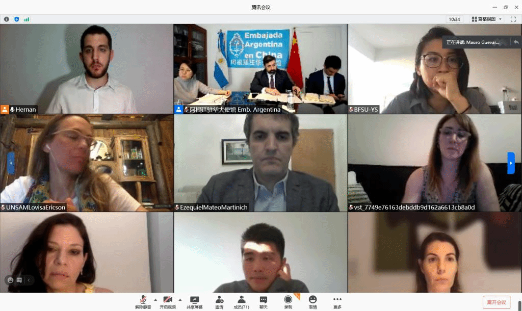 北京時間11月 13日上午,西班牙語教研室鄭斯媛、姜南亦老師與學(xué)校國際合作辦公室才佳琪老師共同參加了由阿根廷駐華使館主辦的阿根廷與中國大學(xué)雙邊交流會議。