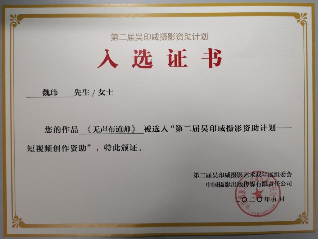 第二屆“吳印咸攝影藝術雙年展”由中國攝影家協會、江蘇省文聯、沭陽縣人民政府主辦。吳印咸先生是中國老一輩攝影藝術家、攝影教育家,為發揚吳印咸先生在電影教育方面的成就,本次雙年展特設立短視頻創作資助。經過組委會專家評審,入圍“短視頻創作資助”共5人。