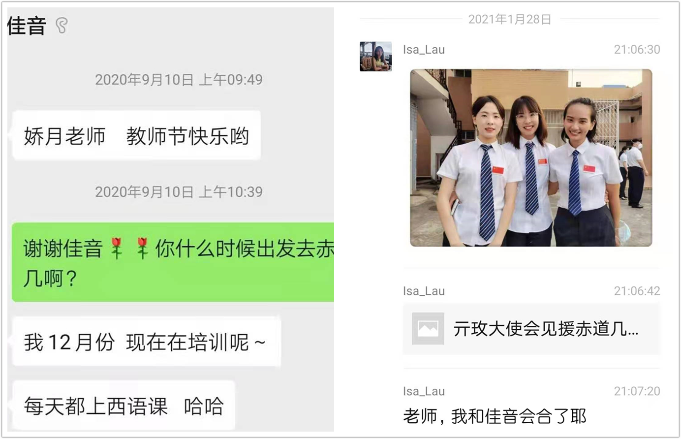 劉慧玲、劉佳音與我校西班牙語專業劉嬌月老師的微信交流