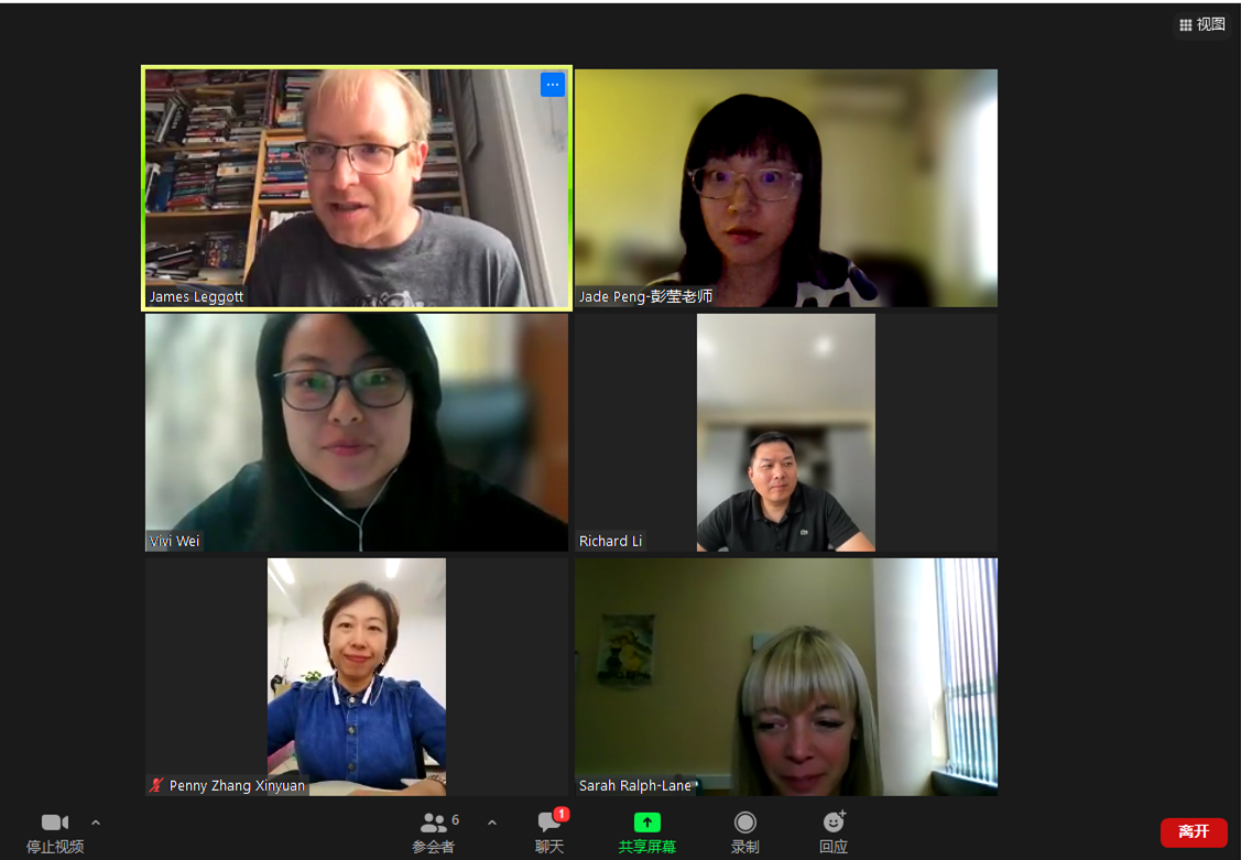 英國諾森比亞大學傳媒系主任James Leggott、大眾傳播項目負責人Sarah Ralph-Lane、國際文化與傳播學部副主任張心遠、傳播系副主任魏渲和傳播學(英國諾森比亞大學雙學位國際課程班)骨干教師彭瑩參與了本此會議。兩校教師商討了2021級中外師生見面會、本科聯合授課的內容安排,并就聯合舉辦“城市文化傳播”主題學術交流進行了前期討論。