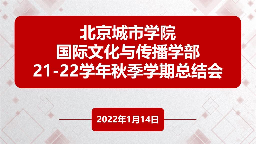 1月14日,北京城市學院國際文化與傳播學部2021-2022學年秋季學期總結會在航天城校區綜合樓一層報告廳舉行。文傳學部全體教師參加了會議,學部副主任張心遠主持會議。