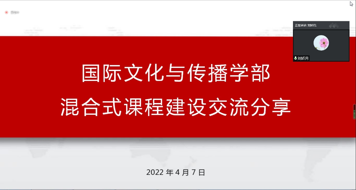 4月7日,國際文化與傳播學部課程建設分委員會在線舉辦了“混合式課程建設交流分享會”。會議由學部課程建設分委員會主任、學部副主任劉嬌月主持,學部全體教師參會。