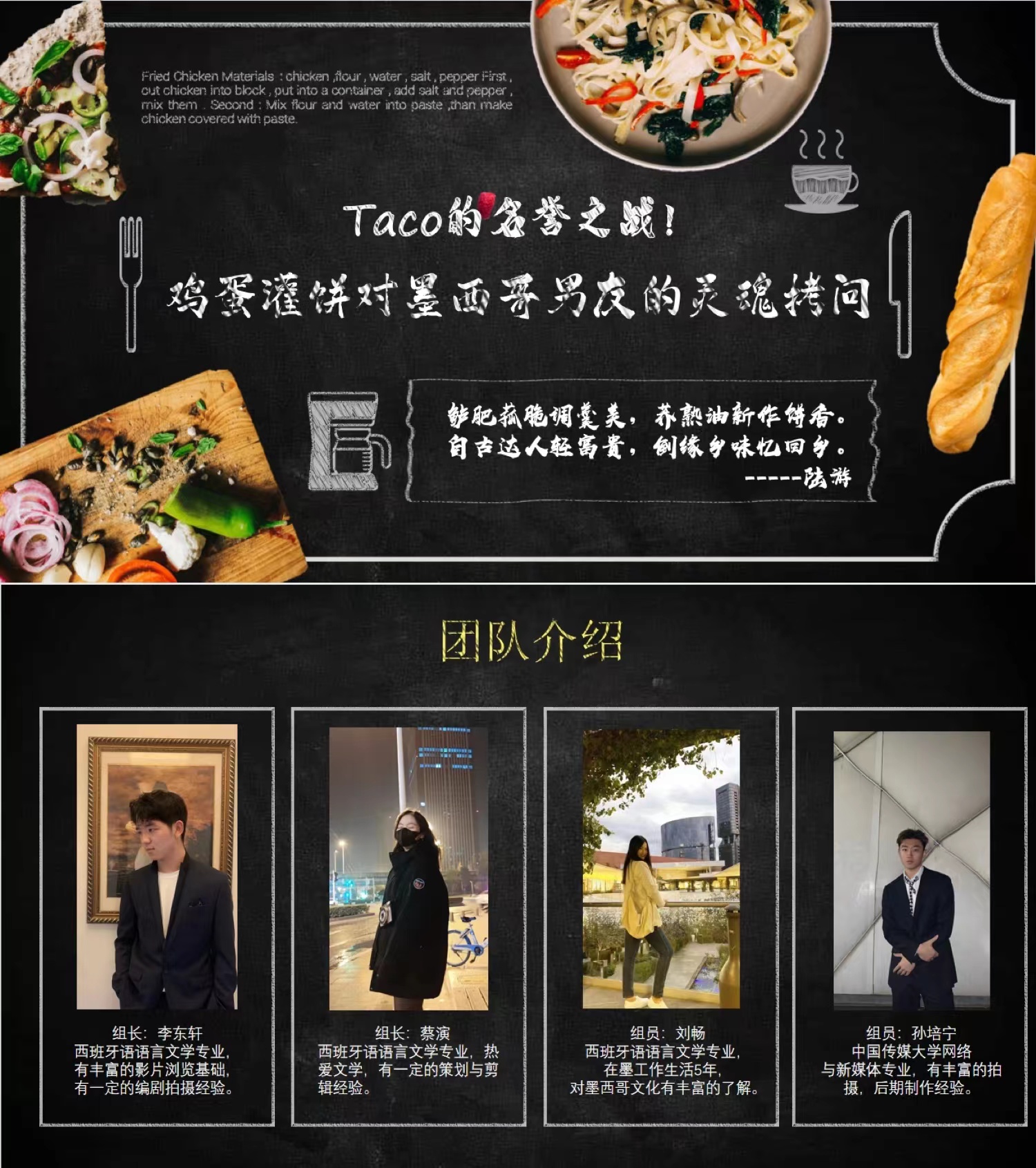 我校國際文化與傳播學部團隊由傳播系李焱老師指導,西班牙語專業2019級李東軒、蔡演同學與我校2020屆西語專業畢業生劉暢(現任我校合作院校墨西哥瓜達拉哈拉大學Proulex 漢語項目協調員)及中國傳媒大學網絡與新媒體專業孫培寧同學跨校、跨年級組隊,圍繞中國“雞蛋灌餅”和墨西哥“塔可”這兩個飲食元素展開,作品《雞蛋灌餅對墨西哥男友的靈魂拷問》從132份投稿作品中脫穎而出,榮獲“優秀策劃獎”,并將獲得專業導師指導和啟動資金支持。