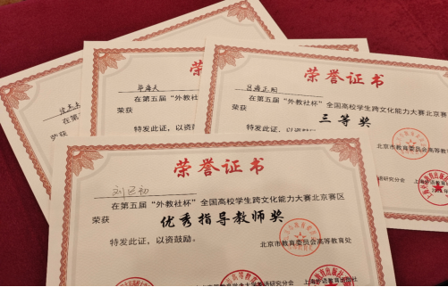 11月6日,國際文化與傳播學部2019級英語專業呂海正陽、2020級德語專業沈杰夫、2021級傳播學(國際視聽實驗班)畢海天三位同學組成的參賽團隊在第五屆“外教社杯”全國高校學生跨文化能力大賽北京賽區比賽中榮獲三等獎。文傳學部英語教研室劉已初老師榮獲優秀指導教師獎。