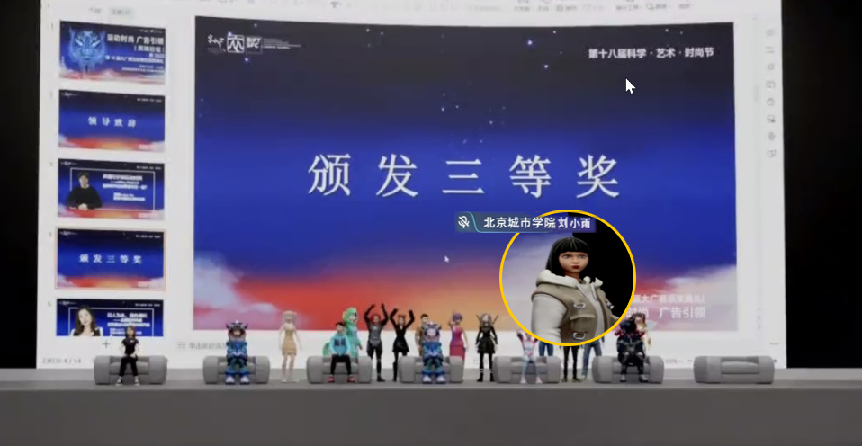 其中,傳播學專業學生何歡、胡子辰、劉小雨作為學生代表及獲獎者參與了“運動時尚 廣告引領”高端論壇及北京賽區頒獎典禮,并以虛擬人物的形象上臺領取了一等獎、二等獎和三等獎。