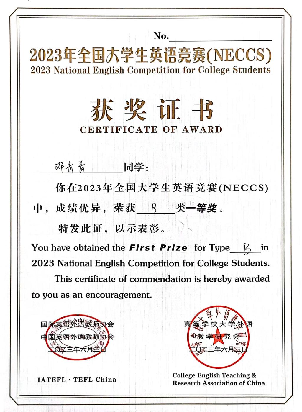 近日,文傳學部英語專業學生參加了2023年全國大學生英語競賽并斬獲佳績。2020級英語本4(商務英語)鄧青青同學以優異的成績獲得B類比賽北京賽區一等獎。