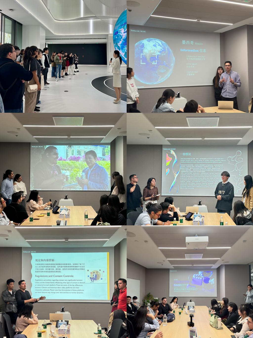 活動前,傳播專業學生與國際學生結成了學習小組,以“中外青年社交短視頻之我見”為題,進行了專題學習與研討,并以小組為單位圍繞主題制作了一分鐘短視頻。抵達抖音集團總部后,工作人員就公司發展史、公司主要產品和業務等向同學們做了介紹。各小組將小組作業作了正式匯報與展示,聽取了公司專業團隊的意見與建議。抖音剪映團隊的員工也向同學們介紹了短視頻模板創作的技巧,并鼓勵同學們運用巧思,積極參與到剪映模板創作中。國際學生們也借此機會,學到了許多與短視頻相關的中文表達,提升了自身語言實踐能力。