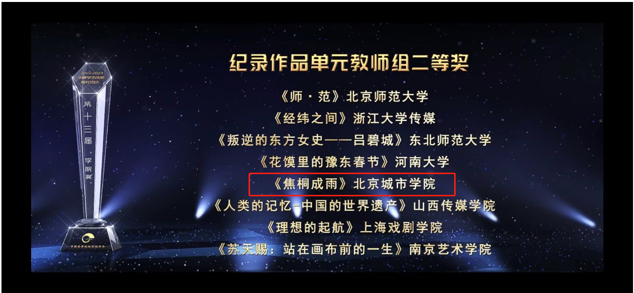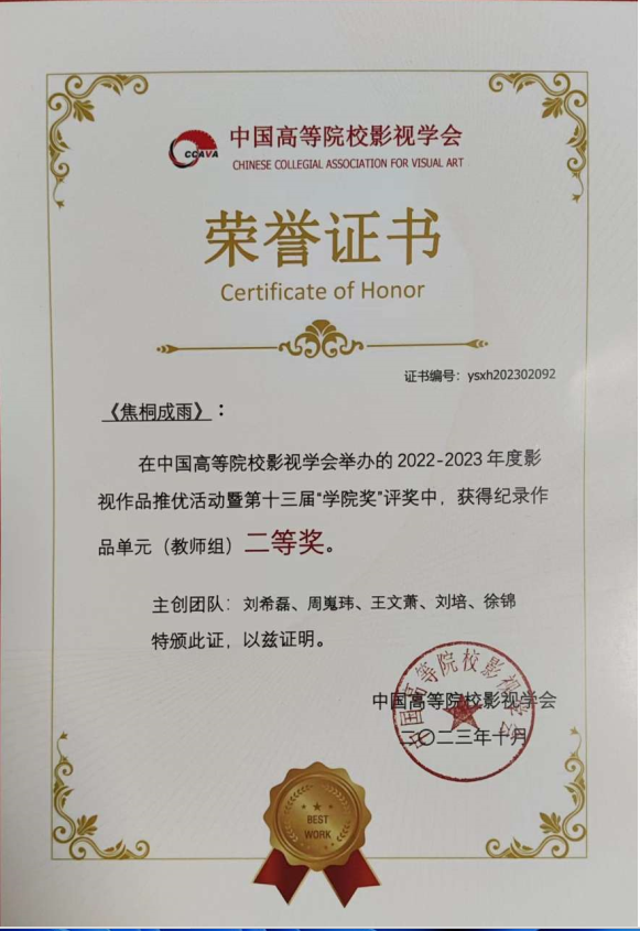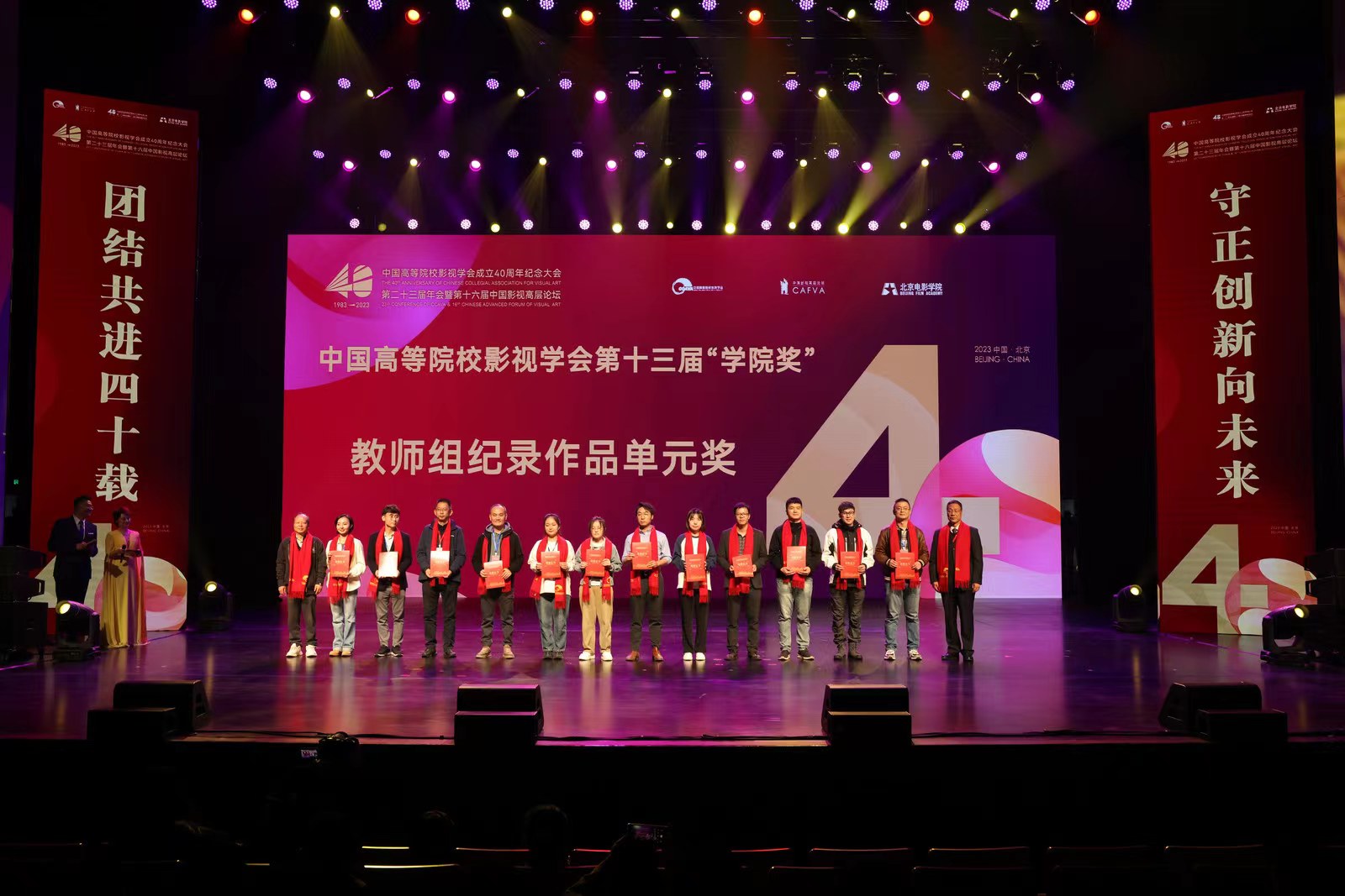10月21日,中國高校影視學會第二十三屆年會2022-2023年度影視作品推優活動暨第十三屆“學院獎”頒獎典禮在北京電影學院懷柔校區千人劇場舉行。來自北京大學、清華大學、復旦大學、上海交通大學、北京師范大學、中國傳媒大學、北京電影學院、澳門大學、澳門科技大學等高校近800名專家、學者參加。我校文傳學部劉希磊、周嵬瑋、王文蕭、劉培、徐錦等擔任主創的作品《焦桐成雨》喜獲第十三屆“學院獎”紀錄片單元(教師組)二等獎。