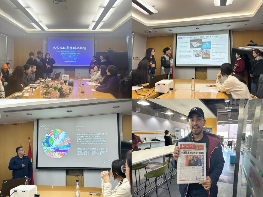 11月9日,我校墨西哥瓜達拉哈拉孔子學院留學生與國際文化與傳播學部傳播學、翻譯專業師生赴環球網參觀訪問,開展了“以文化視角看國際傳播”的雙語主題匯報。活動中,我校中外學生們紛紛表達了對國際文化傳播類短視頻的熱愛,增進了對中外社交短視頻平臺的了解。