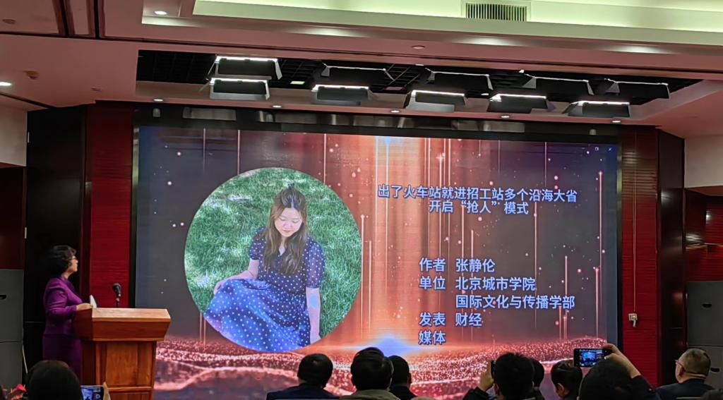 11月25日,第十屆全國(guó)經(jīng)濟(jì)新聞改革與發(fā)展研討會(huì)暨第八屆大學(xué)生經(jīng)濟(jì)新聞作品大賽頒獎(jiǎng)會(huì)在京召開(kāi),我校文傳學(xué)部傳播系2019級(jí)傳播學(xué)專(zhuān)業(yè)張靜倫同學(xué)的作品《出了火車(chē)站就進(jìn)招工站 多個(gè)沿海大省開(kāi)啟“搶人”模式》榮獲“新聞報(bào)道類(lèi)”一等獎(jiǎng),(指導(dǎo)老師:傳播系李升科教授),文傳學(xué)部獲得大賽優(yōu)秀組織獎(jiǎng)。
