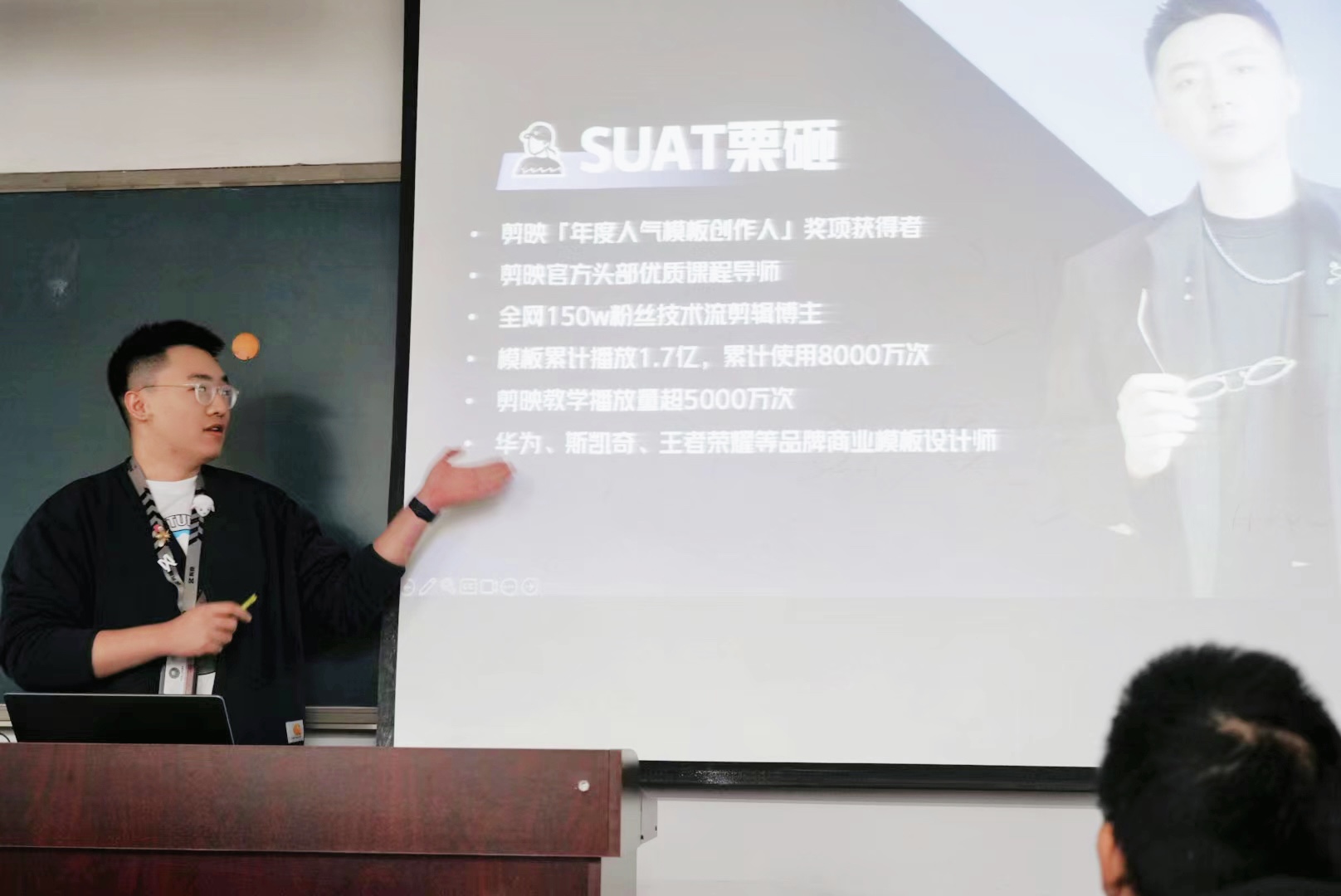 栗砸介紹了剪映模板在用戶創作環節中的重要性,從界面設計、剪輯手法、片頭設計三個方向,就剪映模板創作進行了詳細解讀,演示了一個模板從前期策劃到中期制作再到后期復盤的全流程,運用豐富的案例全面分析了模板呈現要素中聽覺和視覺的具體靈感要素及靈感方向。在創作營自由創作環節,同學們自由組隊在規定時間內現場策劃、創作剪映模板。在作品展示環節,栗砸對同學們的作品進行了詳細點評,并肯定了同學們的融媒體創作意識。