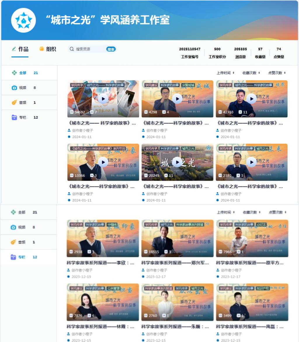 《城市之光——科學家的故事》系列節目由中國科協專項委托我校文傳學部朱方副教授團隊制作并出品,團隊包括20余位校內外教師和文傳學部120余位在校學生。耗時半年時間,先后完成了12篇人物專訪報道、6個訪談視頻作品,并創作了主題曲《城市之光》音頻及MV,成功塑造了我校研究城市科學、解決城市問題的學者形象,弘揚了科學探索精神。系列節目發布于中國科協“風啟學林”社區被廣泛瀏覽與轉發,作品總瀏覽量超過20萬人次。