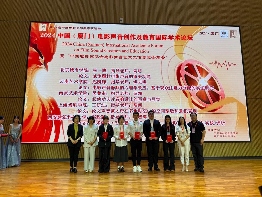 我校國際文化與傳播學部戲劇與影視(廣播電視編導)專業2023級碩士研究生張一博的論文《戰爭題材電影聲音的審美功能》一文榮獲論文推優成果三等獎,并在青年電影聲音論壇上就論文主題做了交流發言。學術導師侯明老師代表學校在電影聲音教育論壇分論壇做了《中國電影聲音藝術學科的教育發展探索》的發言,同時獲得“優秀指導教師”獎。北京城市學院獲得“優秀組織獎”。