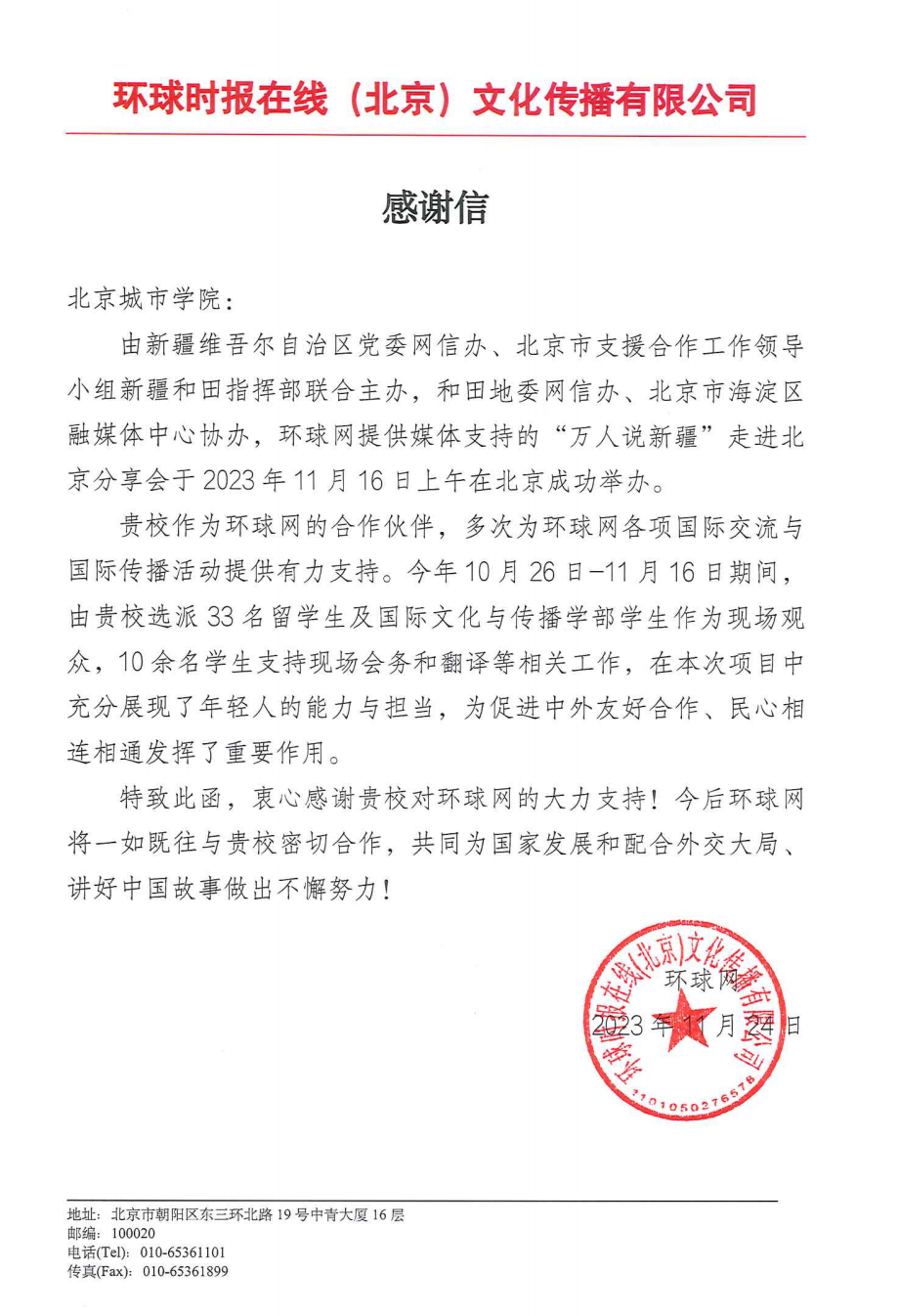 學生參加“萬人說新疆”走進北京分享會提供會務支持及翻譯、收到環球網感謝信