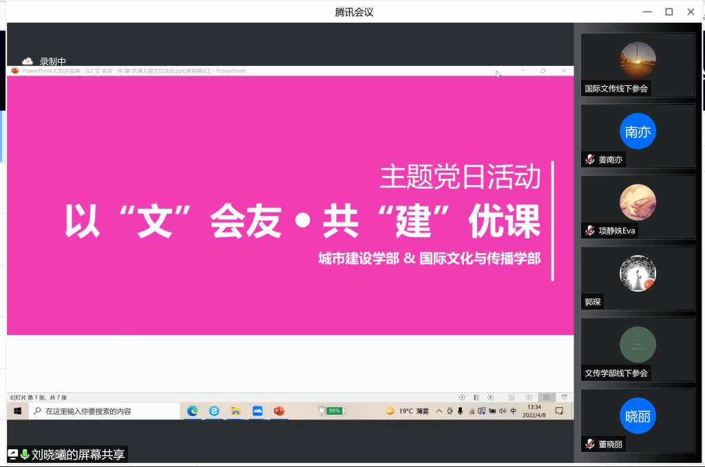 2022年4月8日,城市建設學部黨支部與國際文化與傳播學部黨支部聯合舉辦以“文“會友,共“建”優課主題黨日活動,國際文化與傳播學部主任李嘉懿、黨支部書記周生輝、副主任劉嬌月、城市建設學部主任孟媛、黨支部書記李云青以及兩個學部的全體教師以線上線下方式參加。本次活動的目的是給教師們搭建一個交流的平臺,促進優質課程建設。