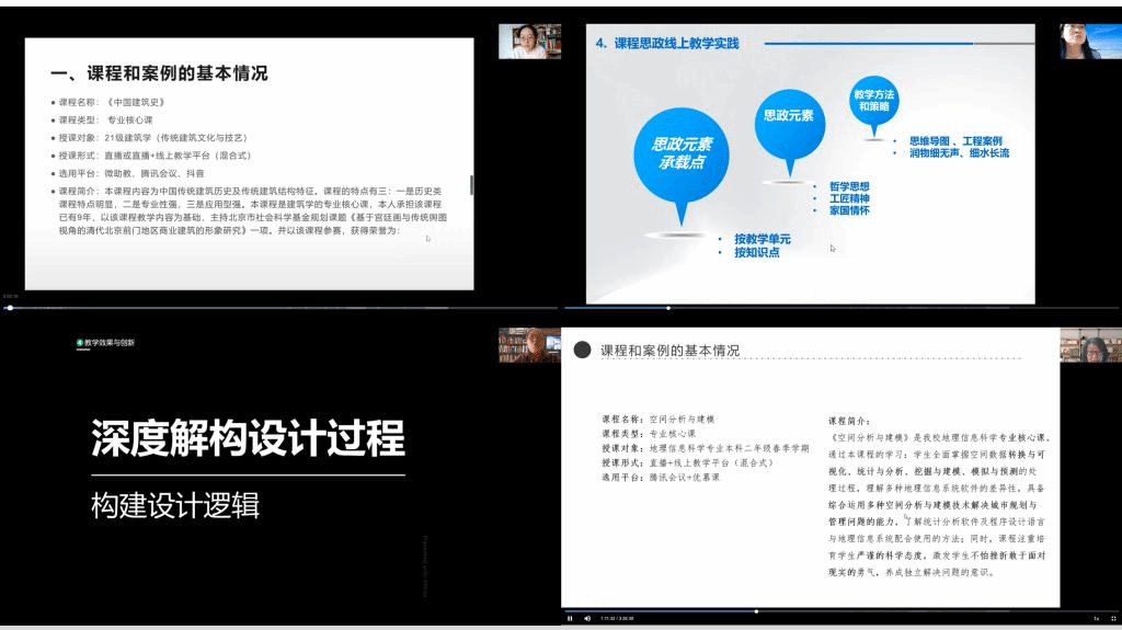 梁飛、高艷華、馬靜、孟媛四位老師分別結合所講授的《中國建筑史》、《工程項目管理》、《場地設計》、《空間分析與建?!?,介紹了線上教學的教學理念、教學設計和教學活動組織的創(chuàng)新點以及教學平臺使用經(jīng)驗等。