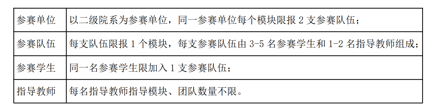 城市建設(shè)學(xué)部工程造價(jià)專業(yè)和土木工程專業(yè)學(xué)生。3~5個(gè)學(xué)生組成一隊(duì),每支隊(duì)伍限報(bào)1個(gè)模塊(模塊內(nèi)容見(jiàn)下文)。