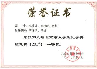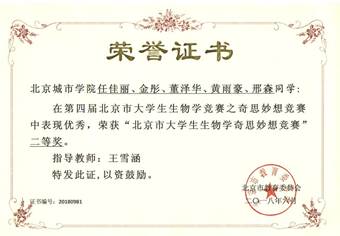 北京市大學生化學實驗競賽獲獎證書 北京市大學生生物學奇思妙想競賽獲獎證書