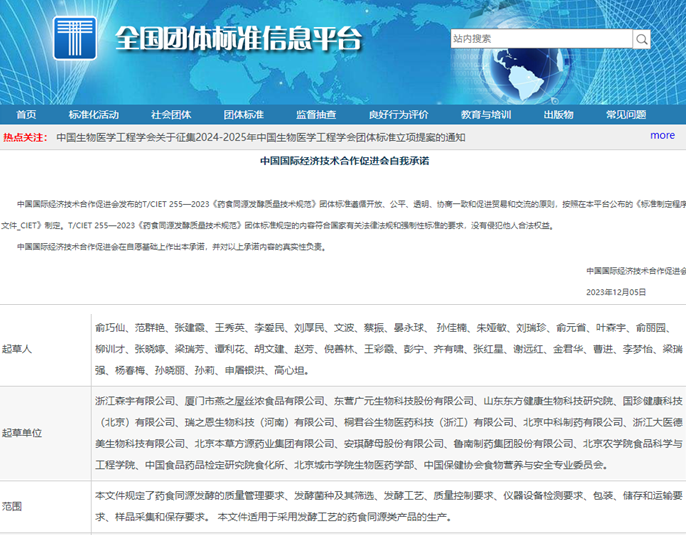 2023年12月5日,由我校生物醫藥學部楊春梅和孫曉麗兩位老師參與起草的《藥食同源發酵質量技術規范》團體標準正式在全國團體標準信息平臺發布。