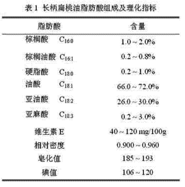 扁桃仁營養(yǎng)成分高度濃縮,含油量高達(dá)50%~60%,富含不飽和脂肪酸,其含量為96~98%,且維生素E含量大于等于48mg/100g。油酸比例較大,理化性狀穩(wěn)定,長期存放不易變質(zhì),易被人體吸收。