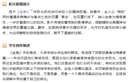 在表演學(xué)部業(yè)務(wù)板塊支持下,由廣播電視編導(dǎo)(影視編創(chuàng))專業(yè)2022級(jí)學(xué)生徐子昀導(dǎo)演、專業(yè)主任劉銘嘉作為攝影指導(dǎo)的短片《金魚》入圍多倫多國際諾萊塢電影節(jié) (TINFF) 、加拿大電影電視學(xué)院 (CANADIAN SCINEMA & TELEVISION) 資格電影節(jié)、ARDEA電影節(jié)以及西普拉電影節(jié)(CFF)。