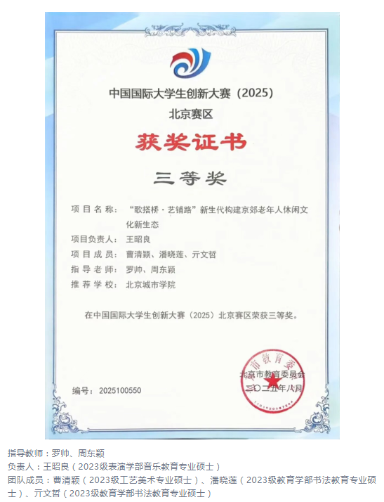 近日,2025年中國國際大學生創新大賽(北京賽區)比賽結果揭曉。表演學部音樂教育專業碩士研究生王昭良帶領的團隊,憑借其參賽項目 “‘歌搭橋·藝鋪路’新生代構建京郊老年人休閑文化新生態”,在激烈的競爭中脫穎而出,榮獲研究生創意組三等獎。