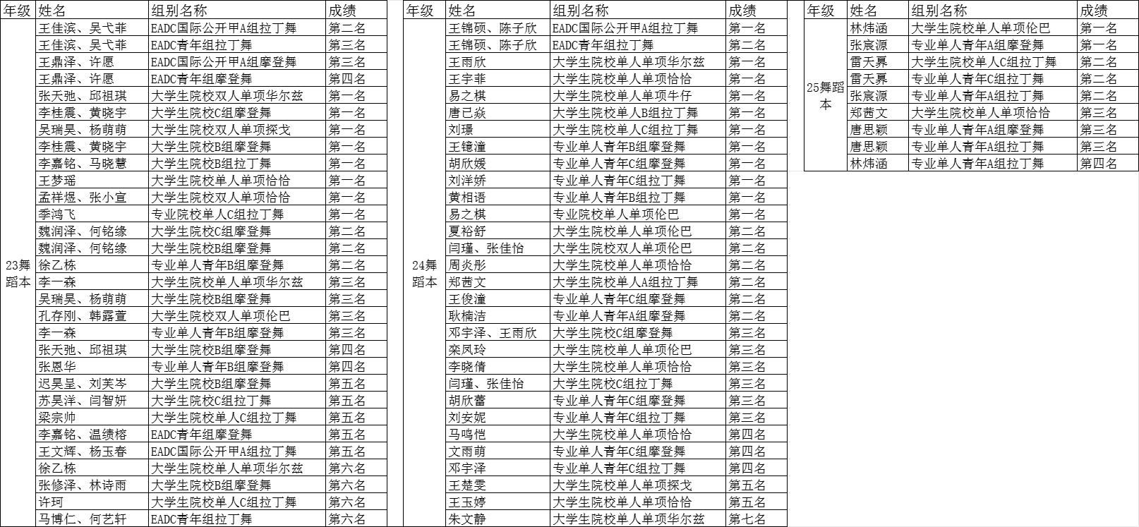 此次賽事活動(dòng)由舞蹈表演(國際標(biāo)準(zhǔn)舞)專業(yè)主任石擎帶領(lǐng)專業(yè)教師邱潔儀、陳帥、董超、齊國凱,以及外聘教師高淼、曹方圓參與賽事工作,專業(yè)教師白欣鷺、外聘教師劉滕騰帶隊(duì)參賽。最終,學(xué)生在最高組別國際公開甲A組、青年組分別獲得各組冠、亞、季軍等共92項(xiàng)榮譽(yù),其中第一名28項(xiàng)、第二名19項(xiàng)、第三名21項(xiàng)。獲獎(jiǎng)成績?nèi)缦拢?/p>