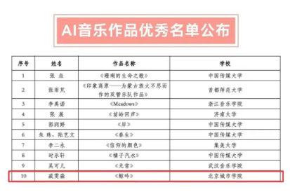 12月15日,由中國音樂家協會高校音樂聯盟、中國音像與數字出版協會、中國傳媒大學聯合主辦的第一屆“人工智能與音樂產業人才培養學術研討會暨人工智能音樂作品展演”評選結果公布。在北京城市學院表演學部音樂教育專業周東穎老師的指導下,2025級學生戚雯淼、李子萱、張栩暢共同創作的AI音樂作品《鯨吟》榮獲優秀作品獎。該作品圍繞海洋環保主題,以鯨魚之聲為敘事核心,借助人工智能技術傳遞生態關懷,最終從全國高校征集作品中脫穎而出,入選全國十部優秀展演作品。