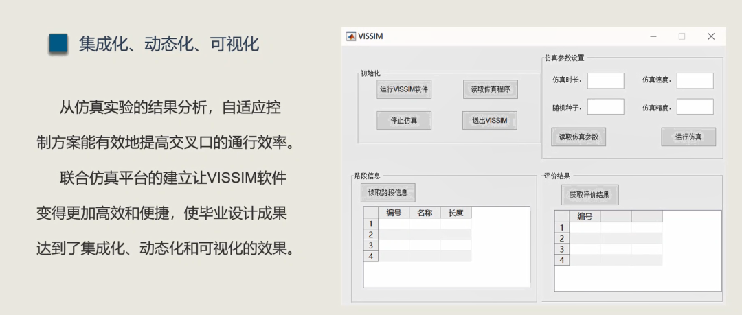 3.實踐性:作品中建立了MATLAB-VISSIM的聯合仿真平臺,通過拓展應用的實例初步了解了VISSIM二次開發。更加方便了同學們在未來的學習,并對VISSIM二次開發有一個更深入的了解。VISSIM的二次開發應用不僅可以提高交通仿真課程的教學效果,還能夠激發學生的學習動力提高學生的學習能力、學習動力,也可以提高學生的創新性能力,也為其他高校進行該課程的教學提供了新的思路,達到更好的教學效果。