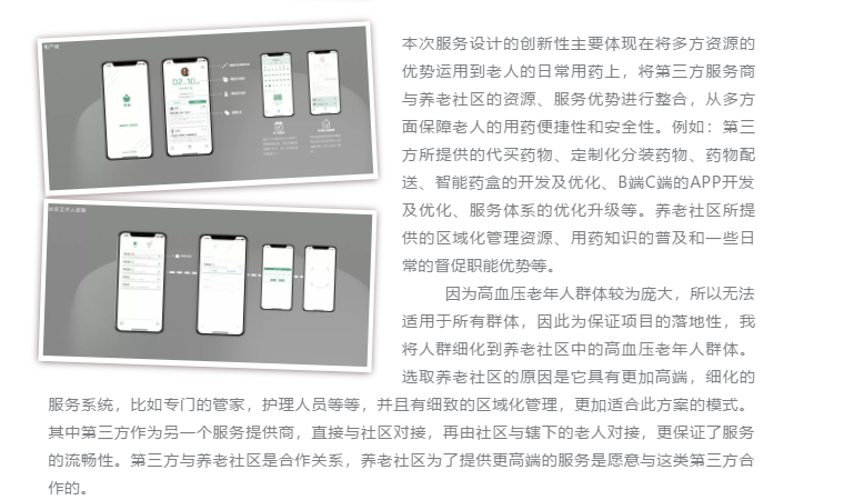 該服務設計作品通過觀察到的高血壓老年人于居家環境中存在的各類用藥問題作為解決的主要目標,整合了養老社區與第三方的服務優勢和資源優勢,將老人、養老社區、第三方作為主體進行聯結,相比于以往老人自己把控吃藥環節而言,加強了外部把控。而智能藥盒作為直接面對老人的用藥智能產品,也采用定制化的配藥體系,合理解決了老人在用藥過程中存在的諸多不便。配套的APP系統也將保障三方體系內信息的互通,并提高第三方與養老社區的服務質量與效率。讓老年患者們安全、合理、放心地吃藥,不再因為吃藥問題而苦惱,也讓他們感受到社會對于他們是關心的、包容的。