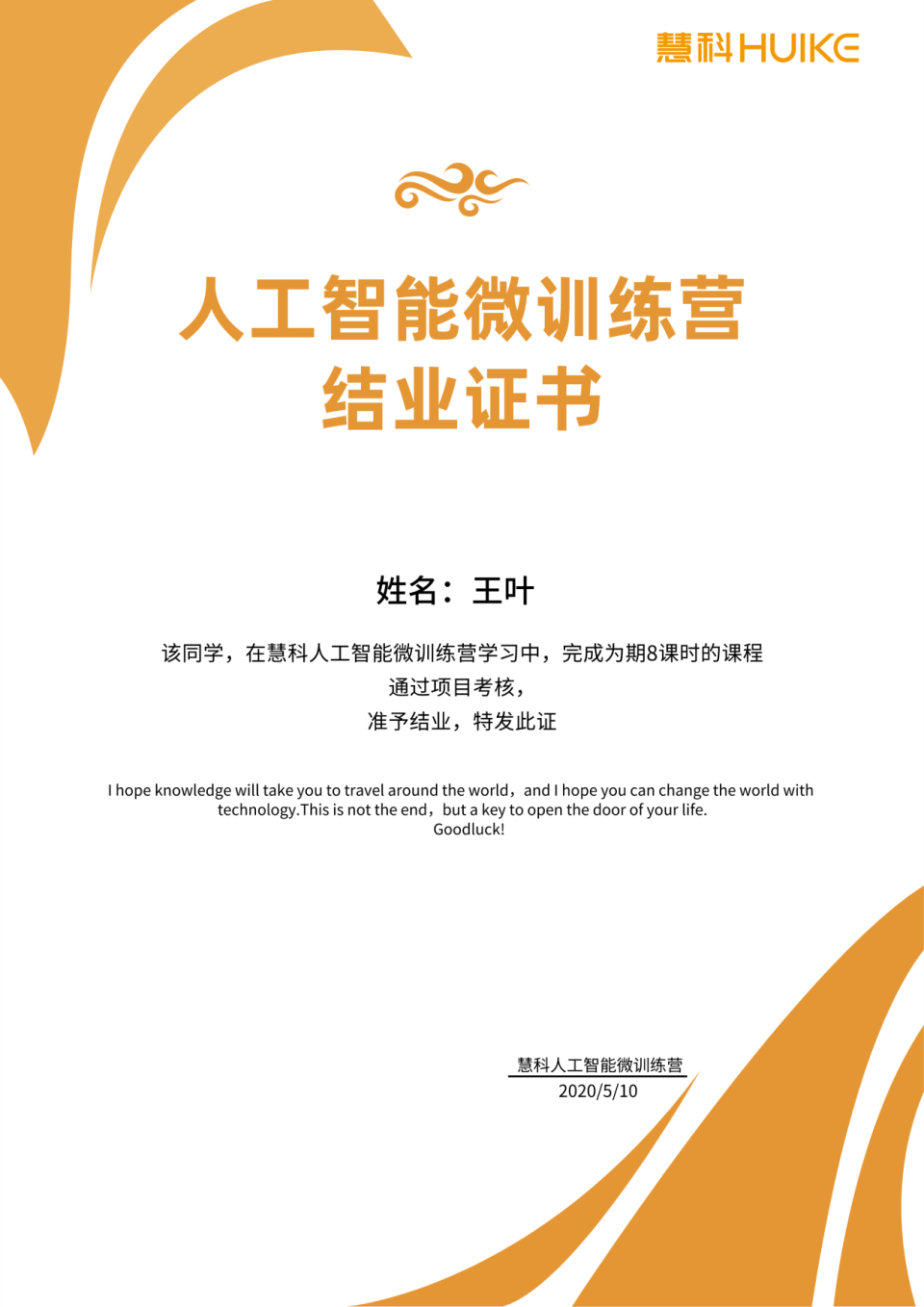 本次訓練營充分貫徹教育部“停課不停學”要求,秉承“立德樹人根本任務,推進產學研合作協同育人,著力培養(yǎng)各行各業(yè)未來領軍人才”的思想,充分發(fā)揮和整合高校與企業(yè)的資源優(yōu)勢,通過豐富的案例訓練、動手實驗、項目策劃與開發(fā)、團隊協作等途徑,幫助學生建立對數據科學和人工智能的認知,檢驗學生對基礎的數據分析方法與工具的掌握,進而培養(yǎng)學生利用數據科學思維和人工智能技術分析問題、解決問題的能力。訓練營結束后,每位參訓同學均獲得了由慧科頒發(fā)的結營證書,為學習之路留下了印記。
