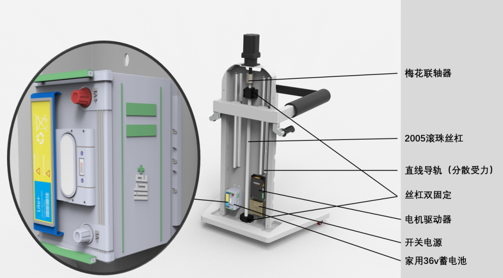 采用步進電機加減速和絲杠外加直線導購分散受力的方式,整體裝置扭矩輸出大、行程范圍大,可以滿足大體重、身體高的老年人,參數(速度、行程)可調,滿足私人定制。該設計填補了市場的空白。