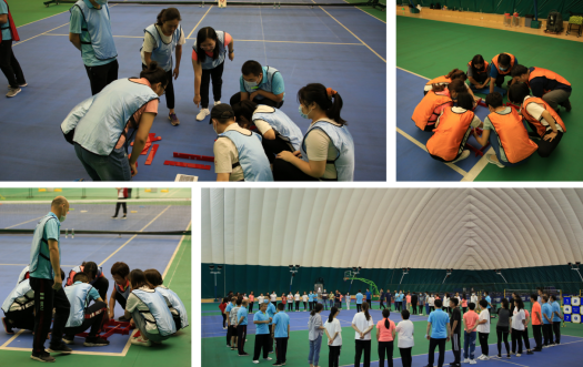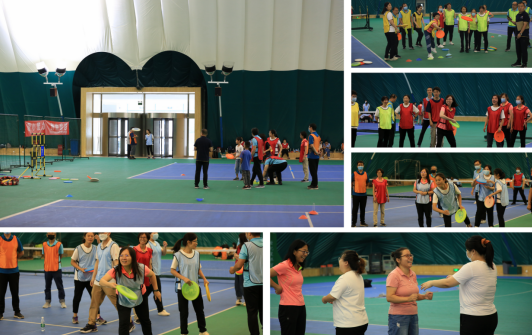 老師們隨機組成9支隊伍,進行了“循環迷宮”、“飛盤擲準”和“聯合工程”三個項目的組隊PK。大家積極主動融入到團隊中,在活動中充分體驗到團隊信任、溝通和協作的重要性。