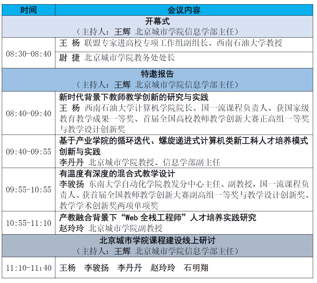 為深化新時(shí)代本科教育教學(xué)改革,貫徹“以學(xué)習(xí)為中心,以學(xué)生為根本”的教育教學(xué)理念,打造“教師為主導(dǎo),學(xué)生為主體”的師生學(xué)習(xí)共同體,提升教師教學(xué)質(zhì)量、豐富教學(xué)方法、開(kāi)拓教學(xué)創(chuàng)新思維,推動(dòng)課堂教學(xué)革命,持續(xù)提高人才培養(yǎng)質(zhì)量,信息技術(shù)新工科產(chǎn)學(xué)研聯(lián)盟定于7月8日開(kāi)展“聯(lián)盟專(zhuān)家進(jìn)高校”系列活動(dòng)的第九站——北京城市學(xué)院,主題為“踐行教學(xué)創(chuàng)新理念 提升專(zhuān)業(yè)建設(shè)水平”。