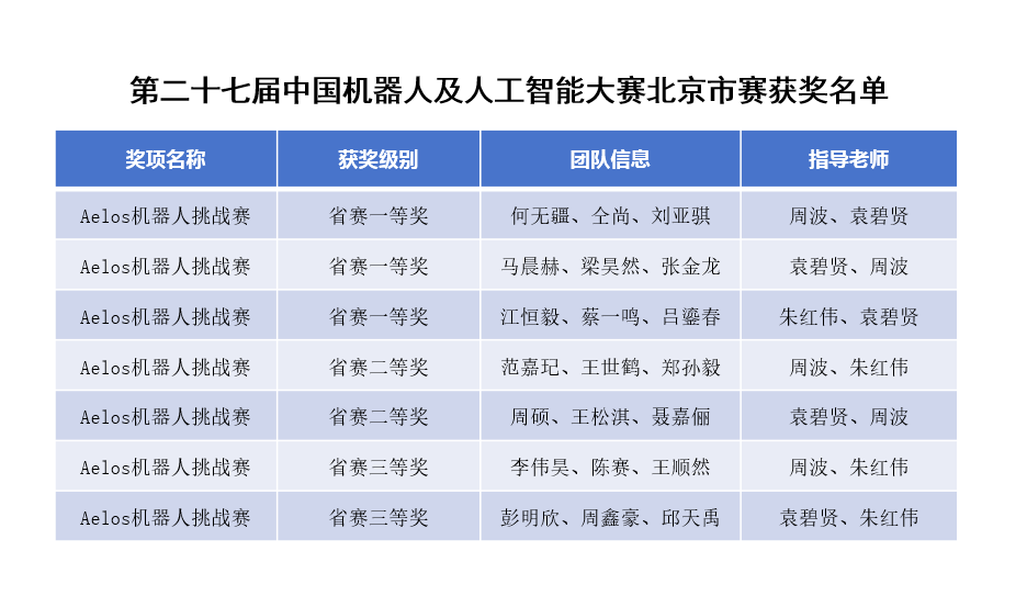 近日,第二十七屆中國機器人及人工智能大賽北京市賽成績公布,信息學部物聯網工程、人工智能、軟件工程三個專業學生組成的參賽團隊表現優秀,在Aelos機器人挑戰賽項目中榮獲一等獎3項、二等獎2項及三等獎2項,四支隊伍晉級國賽。