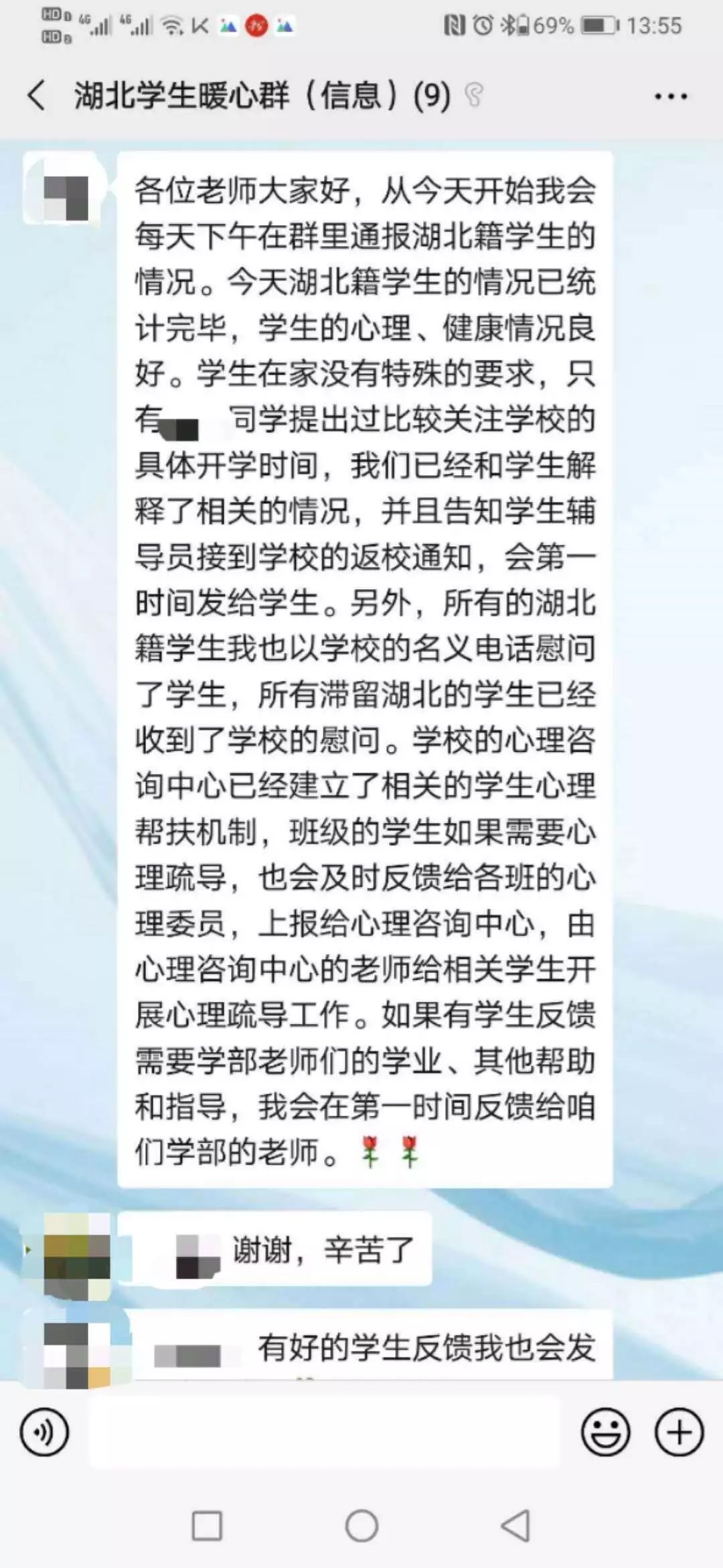 學(xué)部目前有8人學(xué)生在湖北地區(qū),支部為每名學(xué)生配上負(fù)責(zé)教師,堅(jiān)持每日以支部名義為他們送上一句問(wèn)候、一份祝福,對(duì)于學(xué)生遇到的其他問(wèn)題老師也一一給與幫助。