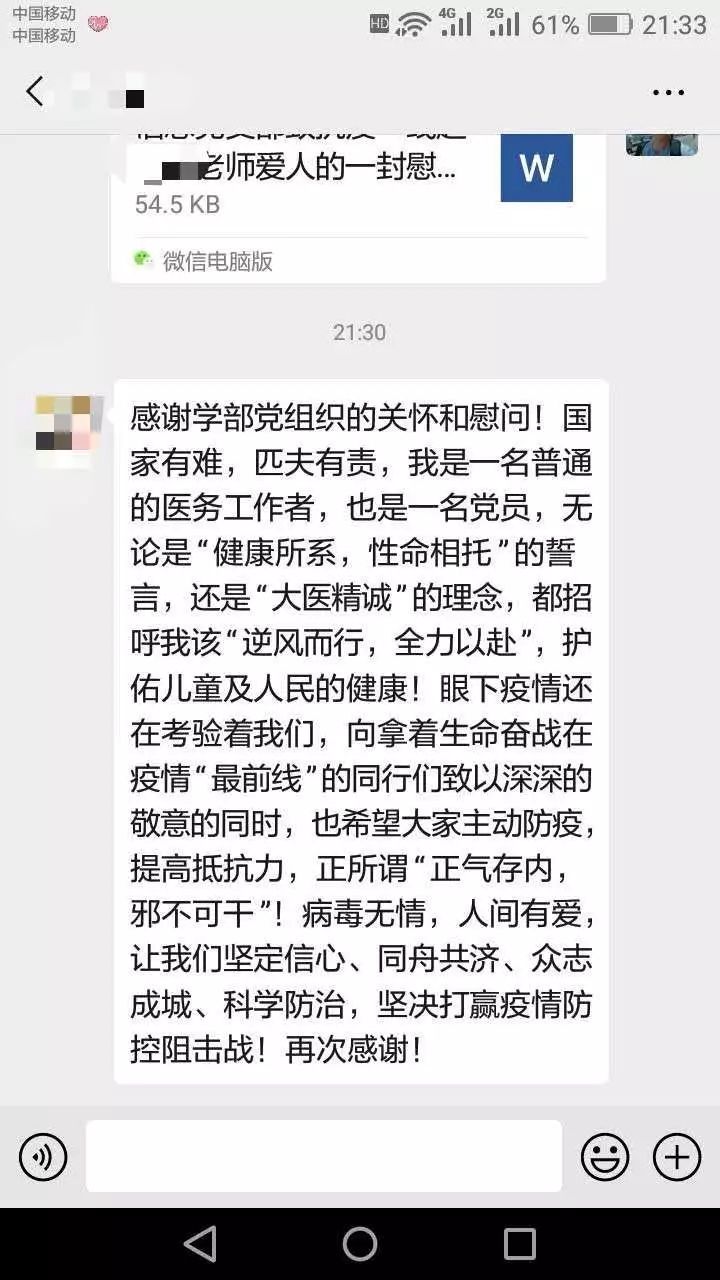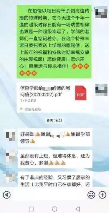 奮斗在教學(xué)一線的兼職教師,像我們的家人一樣并肩作戰(zhàn),是學(xué)部發(fā)展不可或缺的力量。他們的平安健康牽動(dòng)著全體師生的心。疫情發(fā)生后,支部第一時(shí)間委托專業(yè)溝通對(duì)兼職教師轉(zhuǎn)達(dá)支部慰問(wèn)信。