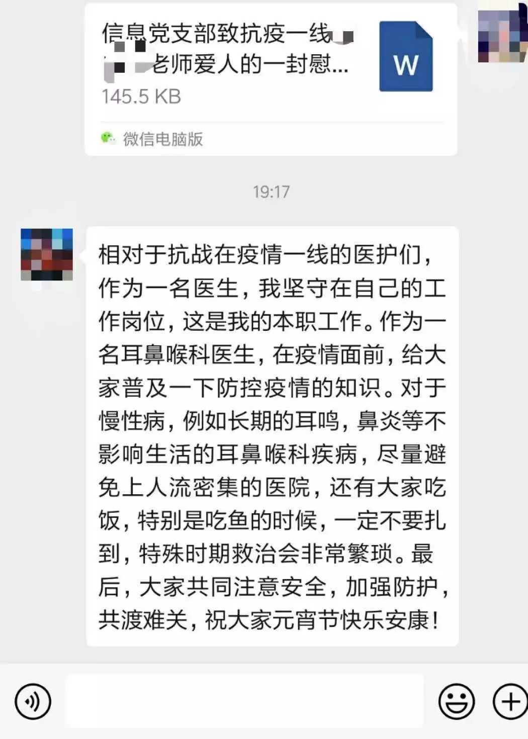 支部通過(guò)多種渠道打聽(tīng)到有多位老師的親人都戰(zhàn)斗在抗擊疫情一線,他們堅(jiān)守后方、照顧家庭、為打贏這場(chǎng)攻堅(jiān)戰(zhàn),默默奉獻(xiàn)著自己的力量。支部代表學(xué)校主動(dòng)關(guān)心服務(wù),送去問(wèn)候,幫助解決后顧之憂。
