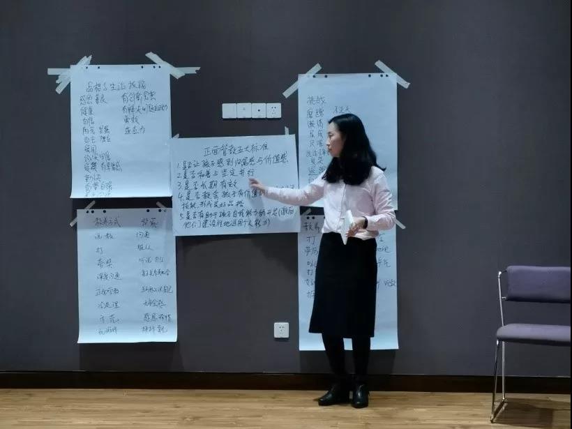 講座會采用座談交流的形式進行。吳老師首先讓在座的老師說出自己孩子的缺點,然后說出期望孩子將來具有什么樣的品格和能力,都一一列舉出來寫在紙上。隨后,吳老師告訴大家,這些缺點是很多孩子共有的,并不可怕,如果一個孩子什么缺點都沒有才是可怕的事情。要將這些缺點作為財富,采用合適的教育方法——正面管教,讓孩子逐步改進,將壞事變成好事。