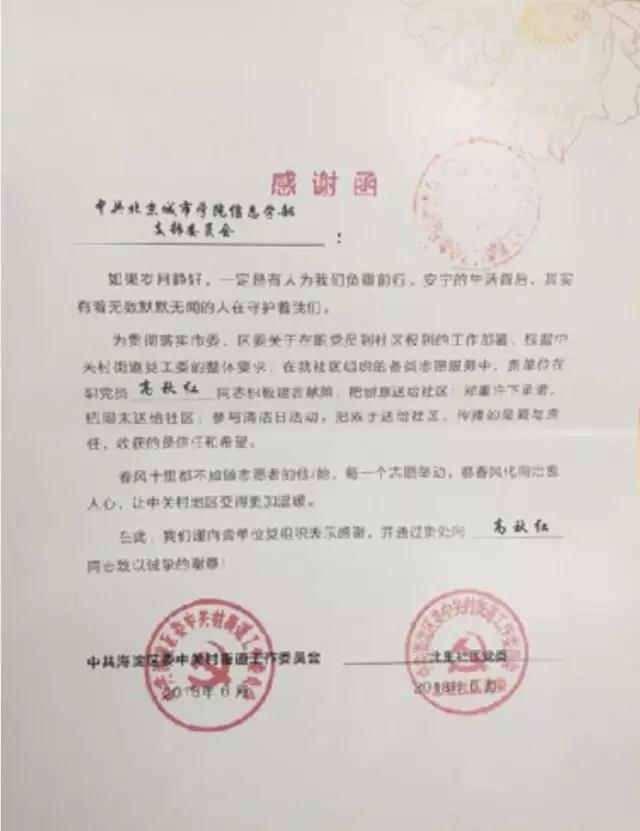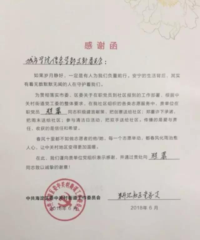 在活動中,涌現出很多突出事跡,鼓舞著和感染著我們。趙連強老師在社區改造中擔任宣傳引導員的一事被《順義時訊》報道。趙連強老師所在的社區正在進行社區改造,居民眾口難調。他積極發揮黨員先鋒模范作用,主動向街坊鄰居做好解釋,爭取更多居民的支持和參與;對于車輛占道、樓道雜物堆放影響施工的問題積極協調,對社區私種樹木的行為予以制止,切實維護了整治改造的成果。《京郊日報》報道了尹麗麗老師參加社區的“愛護家園清潔環境”活動。尹麗麗老師在活動中發揮先進模范帶頭作用,拿起掃帚、鏟子等工具,頂著烈日,本著不怕臟、不怕累的精神,讓積極勞動的熱情溢滿整個社區。高秋紅、程巍、練嵐香老師在社區服務活動中表現突出,收到了北京海淀區中關村街道工作委員會的感謝函。劉雪梅、汪敏老師在黨的生日來臨之日為社區建設提出合理化建議被社區采納……