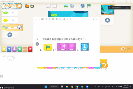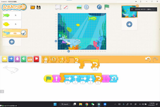 2023年1月14、15日晚19時,“編程啟迪智慧,信息互聯未來”少兒編程公益課活動第一期第二課再次如約而至,本節課的講師是21數據本1班的高文奇同學,助教為20數據本2班的杜佳凝、21機電本班的向君豪和郭梓陽同學。本次課程的主題是“奇妙的海底世界”。講師高文奇同學用編程的語言帶領小朋友們開啟了一段奇妙的海洋之旅,對海底世界中小魚的活動軌跡進行了細致的編程教學。