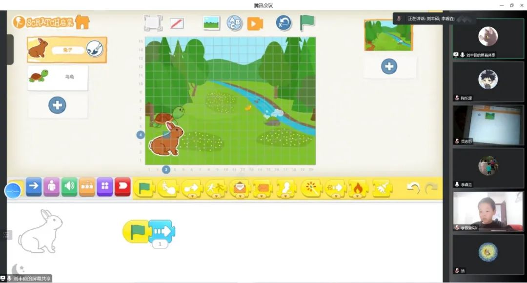 講師劉豐碩同學通過龜兔賽跑這個耳熟能詳的故事帶領小朋友們走進了編程的世界,課堂上,小朋友們踴躍回答問題、積極提出疑問,學習現場氣氛熱烈。